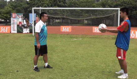 练习的时候要求距离相隔4到5米。注意用力的时候一定要明确,眼睛一定要张开。在头球的练习当中很容易出现的问题,一个就是闭上眼睛,一个是脖子收回来,有怕球的感觉。