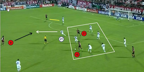 3、“ 区域密集,协防保护”:就是在整体回防到位的前提下,对于对方持球队员及其附近区域要形成足够的人数优势和紧缩队员之间的距离,并对抢球或逼近对方持球队员的同伴,给予一定的斜线保护,以在同伴被突破时能够及时补位和重新布阵。