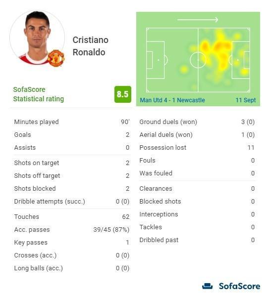 直播车9月12日讯消息,C罗在回归曼联的首场比赛中6次射门打进2球,获评8.5分。