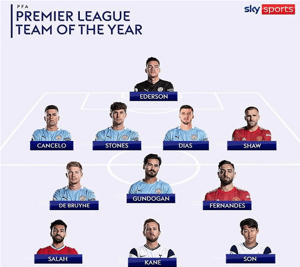 直播车讯 英格兰职业球员协会(PFA)公布了本赛季英超最佳阵容,而这个最佳阵容和大部分球迷想象的一样,表现最好的球员全部入选了。而入选最佳阵容的11名球员中,6人来自曼城,2人来自热刺,2人来自曼联,1人来自利物浦。不知道,你喜欢的球星有没有入选赛季最佳阵容呢?好了,话不多说,一起看看英格兰职业球员协会评选的赛季最佳阵容吧!