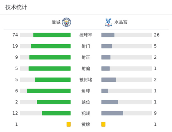 最终曼城连丢2球2-2遭水晶宫逼平。