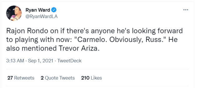 当被问及这支湖人里有没有他特别想要一起合作的球员时,朗多提到了三个名字:“卡梅隆(安东尼)、显然还有拉斯(威斯布鲁克),而且我还很期待和特雷沃(阿里扎)之间的交流,从他身上学习。”