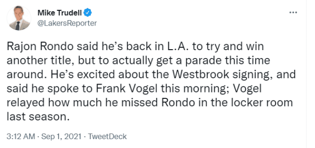 朗多表态,这次重回湖人打球,目标就是尝试赢下另一座总冠军奖杯,并参加夺冠游行。上一次湖人夺冠,因疫情原因没能进行夺冠游行,霍华德也表达过类似的遗憾。朗多对威少的签约感到兴奋,主教练沃格尔还告诉朗多,特别想念他在更衣室里的声音。