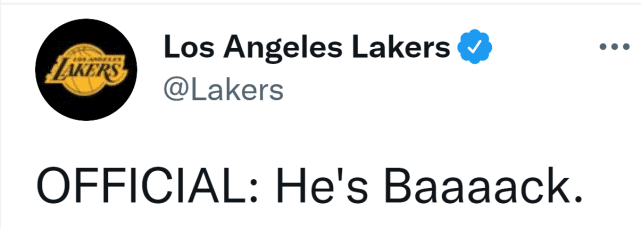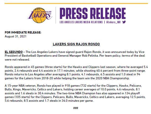 湖人官方社媒先晒出朗多的定妆照,并配文写道:“官方:他回来了。”随后,他们又贴出朗多来到训练馆的视频和签约照。朗多本人也向湖人球迷打招呼,期待能为湖人再夺总冠军。