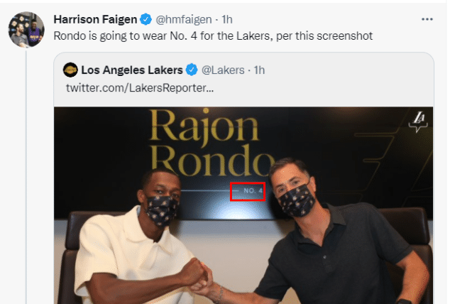 湖人记者哈里森-费根表示,根据现场的海报板信息,朗多回到湖人应该会改穿4号球衣。此前的9号,现在穿在贝兹莫尔身上。