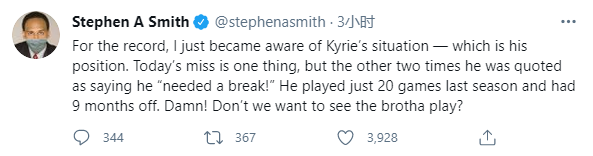 A-史密斯还发推写道:现在我意识到这就是欧文的立场,再次缺席是一回事,但另外两次他说需要休息,上赛季他只打了20场比赛,休息了9个月,难道我们不想看你的比赛吗?