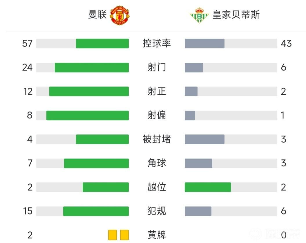直播车讯 :北京时间3月10日4:00,欧联1/8决赛首回合,曼联主场对阵皇家贝蒂斯。上半场B费将球传向禁区,路易斯-费利佩解围失误,拉什福德爆射破门,之后路易斯-恩里克送出助攻,阿约塞-佩雷斯低射破门扳平比分,半场尾声德赫亚传球被断,阿约塞-佩雷斯的射门折射后击中立柱。下半场安东尼内切兜射直挂死角再次取得领先,随后卢克-肖开出角球,B费头球破门扩大比分,之后麦克托米奈射门被扑,韦格霍斯特补射破门锁定胜局。全场结束,曼联4-1战胜贝蒂斯。